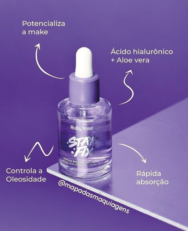 Serum Stay Fix es un sérum potenciador de rápida absorción con activos como Ácido Hialurónico, Extracto de Algodón, Aloe Vera y Manzanilla, que brindan fijación y durabilidad del maquillaje, acabado impecable e hidratación, dejando tu piel suave, radiante y saludable. Se puede utilizar antes del maquillaje para preparar la piel, mezclado con base o corrector para diluir la textura del producto al aplicarlo en el rostro. También se puede utilizar para fijar brillos y pigmentos.
