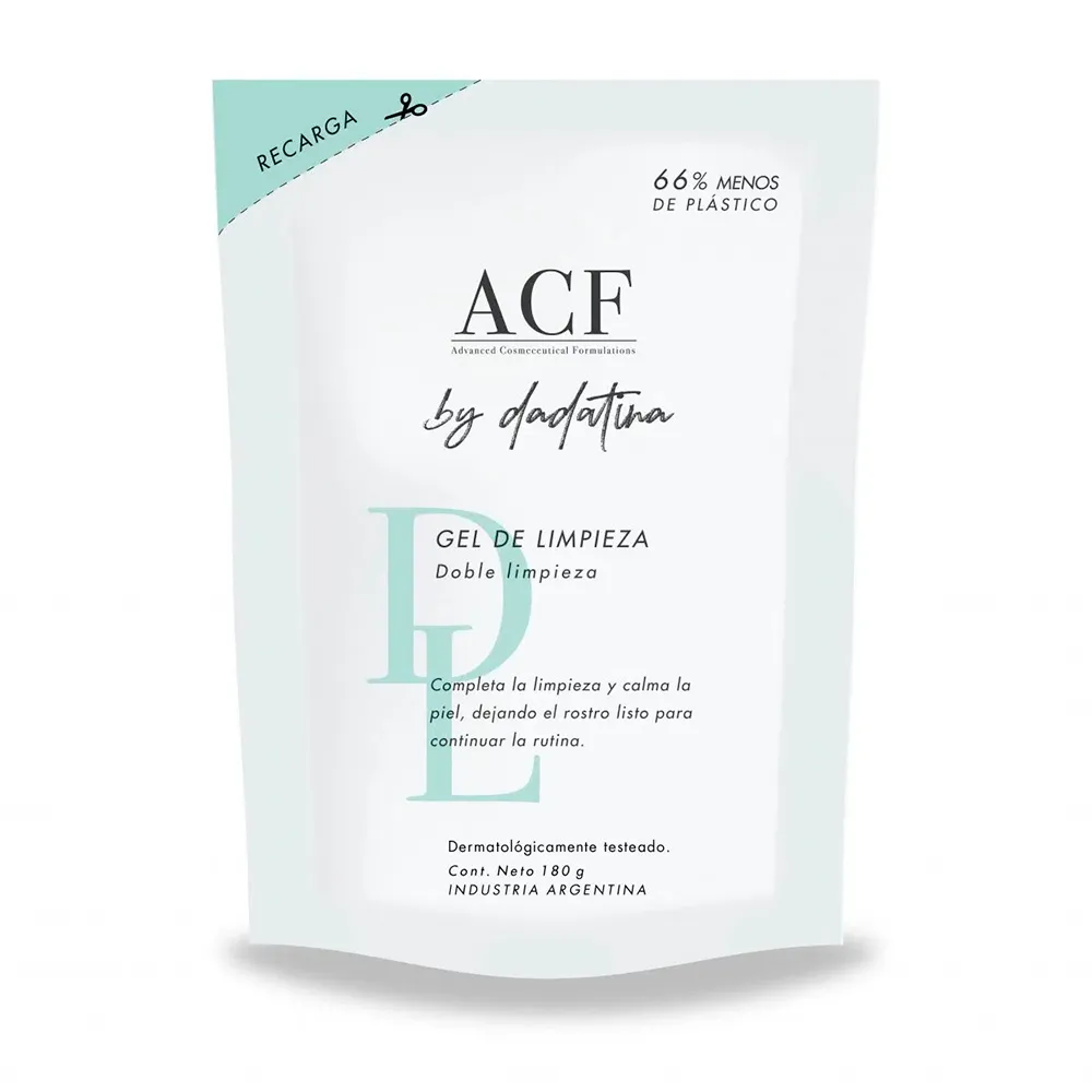 Envase ecológico para rellenar tu gel de limpieza ACF by Dadatina, cada envase utiliza 66% menos plástico.
