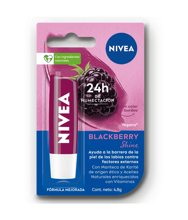El Protector labial humectante NIVEA Blackberry Shine cuida a los labios para mantenerlos suaves y protegerlos del resecamiento. Su fórmula contiene Extractos de Mora y Aceites de origen natural, ingredientes que entregan un delicado toque de color para fundirse instantáneamente e hidratar los labios hasta por 24 horas. Es adecuado para todo tipo de pieles y está probado dermatológicamente.