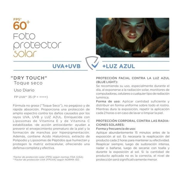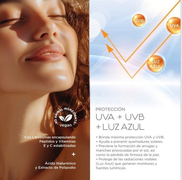 Proporciona una protección de amplio espectro contra los daños causados por los rayos UVA, UVB y Luz Azul. Enriquecida con Liposomas de Vitamina E y de Vitamina C estabilizadas - de acción antioxidante - ayudan a prevenir el envejecimiento prematuro de la piel y la formación de manchas por hiperpigmentación. Ademas contiene Ácido Hialurónico, extracto de Polipodio y Liposomas de Péptidos que humectan y protegen la matriz extracelular ofreciendo una defensa completa y efectiva.